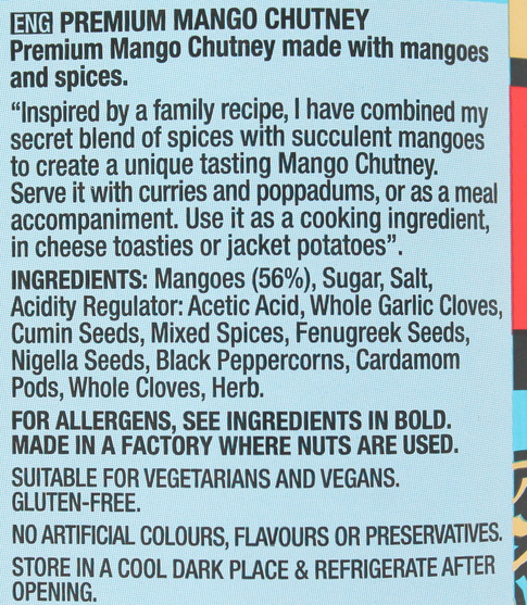 Inspired by a family recipe. Geeta’s Premium combination of a secret blend of spices with succulent mangoes creates a deliciously unique Mango Chutney. Serve with curries and poppadoms or as a meal accompaniment. Use it as a cooking ingredient in cheese toasties or jacket potatoes.