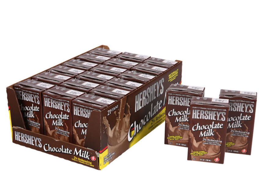 Hershey’s Chocolate MilkDrinks make a perfect treat that isn’t too naughty. With 2% reduced fat and 1/3 less fat than whole chocolate milk. Hershey’s Chocolate Milk is naturally produced and without artificial hormones. with added Vitamins A & D.