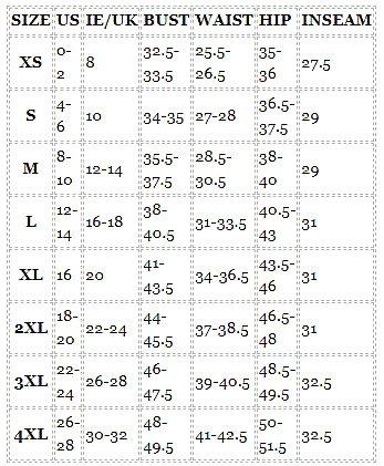 SIZE US IE/UK BUST WAIST HIP INSEAM